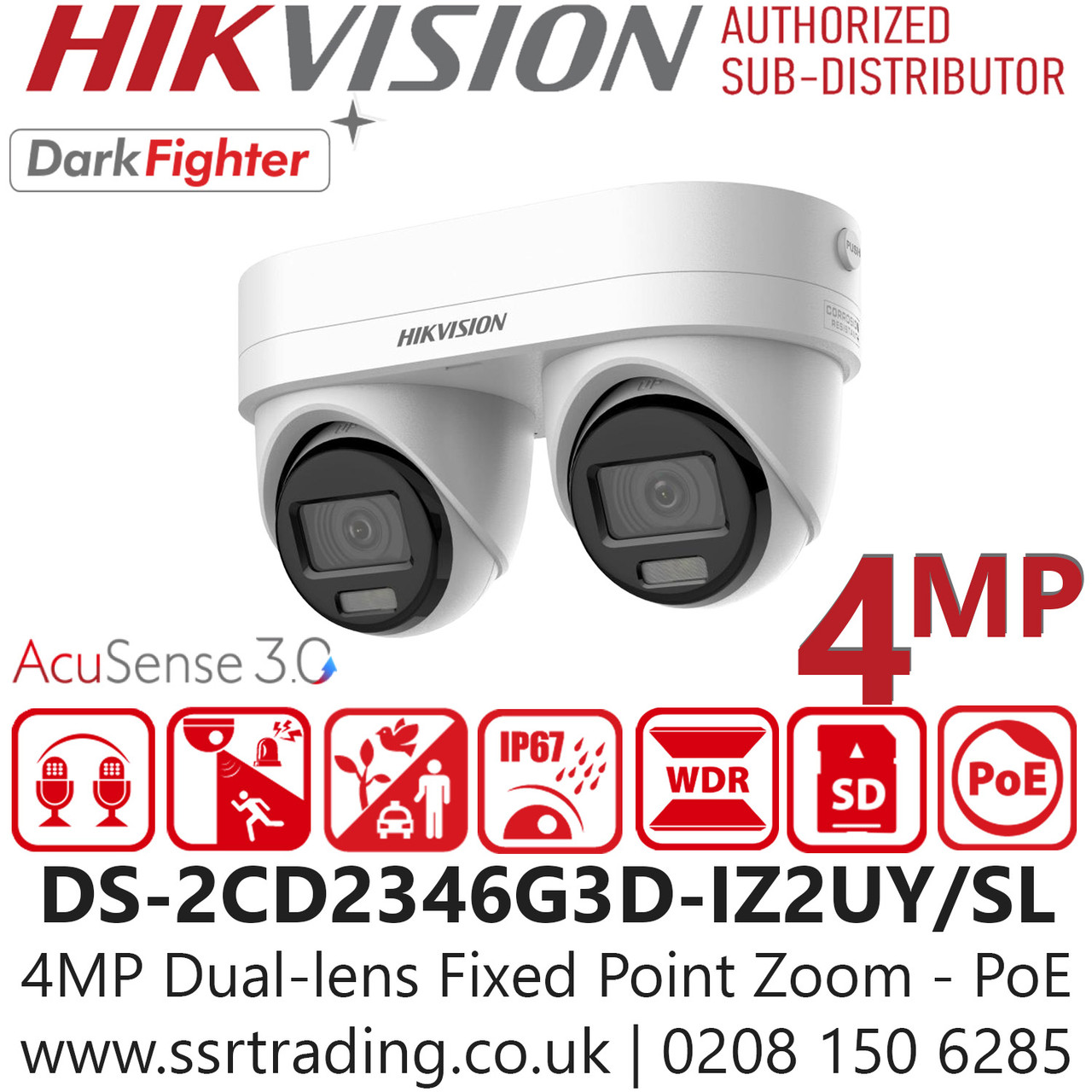 Hikvision DS-2CD2346G3D-IZ2UY/SL is a 4MP dual-lens turret network camera featuring motorised varifocal lenses (2.8mm/4mm), DarkFighter low-light technology, and deep learning-based human and vehicle classification. Designed for professional-grade surveillance, it offers active deterrence with strobe light and audio alarm, plus crystal-clear audio via dual microphones. With IP67 and NEMA 4X-rated anti-corrosion housing, it’s ideal for harsh UK environments. The camera supports dual-channel video, smart analytics, and flexible installation. NDAA-compliant and GDPR-ready, it’s perfect for commercial, industrial, and critical infrastructure security. Seamlessly integrates with Hikvision NVRs and VMS platforms for advanced monitoring and control.