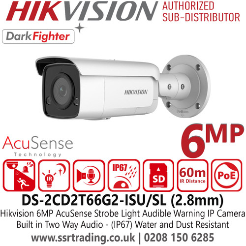 DS-2CD2T66G2-ISU/SL Hikvision 6MP DarkFighter AcuSense Strobe Light and Audible Warning IP Bullet Camera With 2.8mm Fixed Lens, Built in Two Way Audio