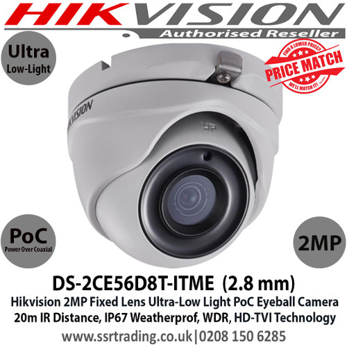 Hikvision 2MP 2.8mm Fixed Lens Ultra-Low Light HD-TVI PoC Eyeball CCTV Camera, 20m IR Distance, IP67 Weatherproof, WDR, True Day/Night, Smart IR, EXIR 2.0 - DS-2CE56D8T-ITME (2.8mm)