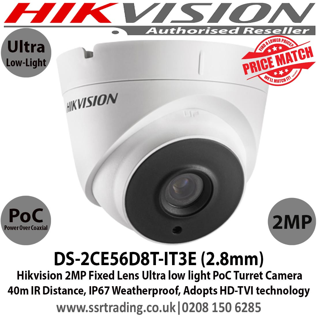 Hikvision 2MP 2.8mm Fixed Lens Ultra Low Light HD-TVI PoC Turret CCTV Camera, 40m IR Distance, IP67 Weatherproof, True Day/Night, Smart IR, EXIR 2.0 - DS-2CE56D8T-IT3E (2.8mm)