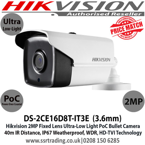 Hikvision 2MP 3.6mm Fixed Lens Ultra-Low Light HD-TVI PoC Bullet Camera, 40m IR Distance, IP67 Weatherproof, WDR, True Day/Night, Smart IR, EXIR 2.0 - DS-2CE16D8T-IT3E (3.6mm)
