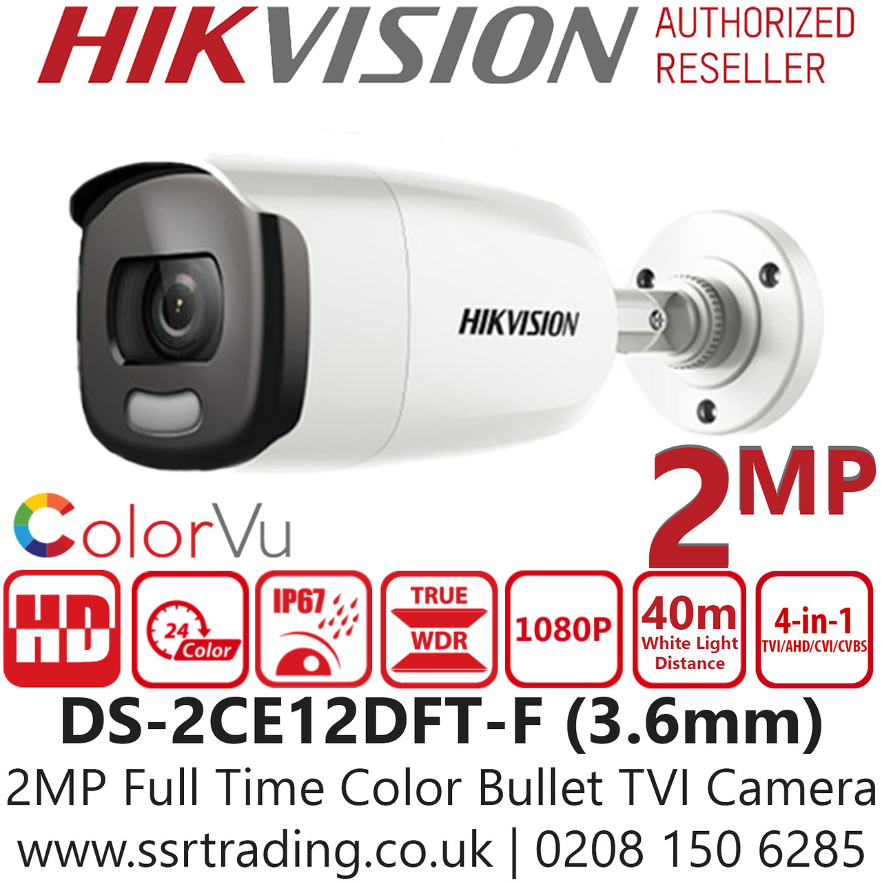 Hikvision 2MP ColorVu 4-in-1 Outdoor Bullet Camera - 3.6mm Lens - DS-2CE12DFT-F