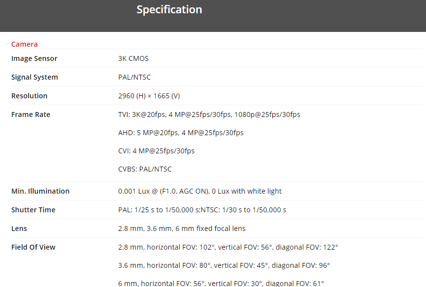 - 2.8 mm, 3.6 mm, 6 mm fixed focal lens