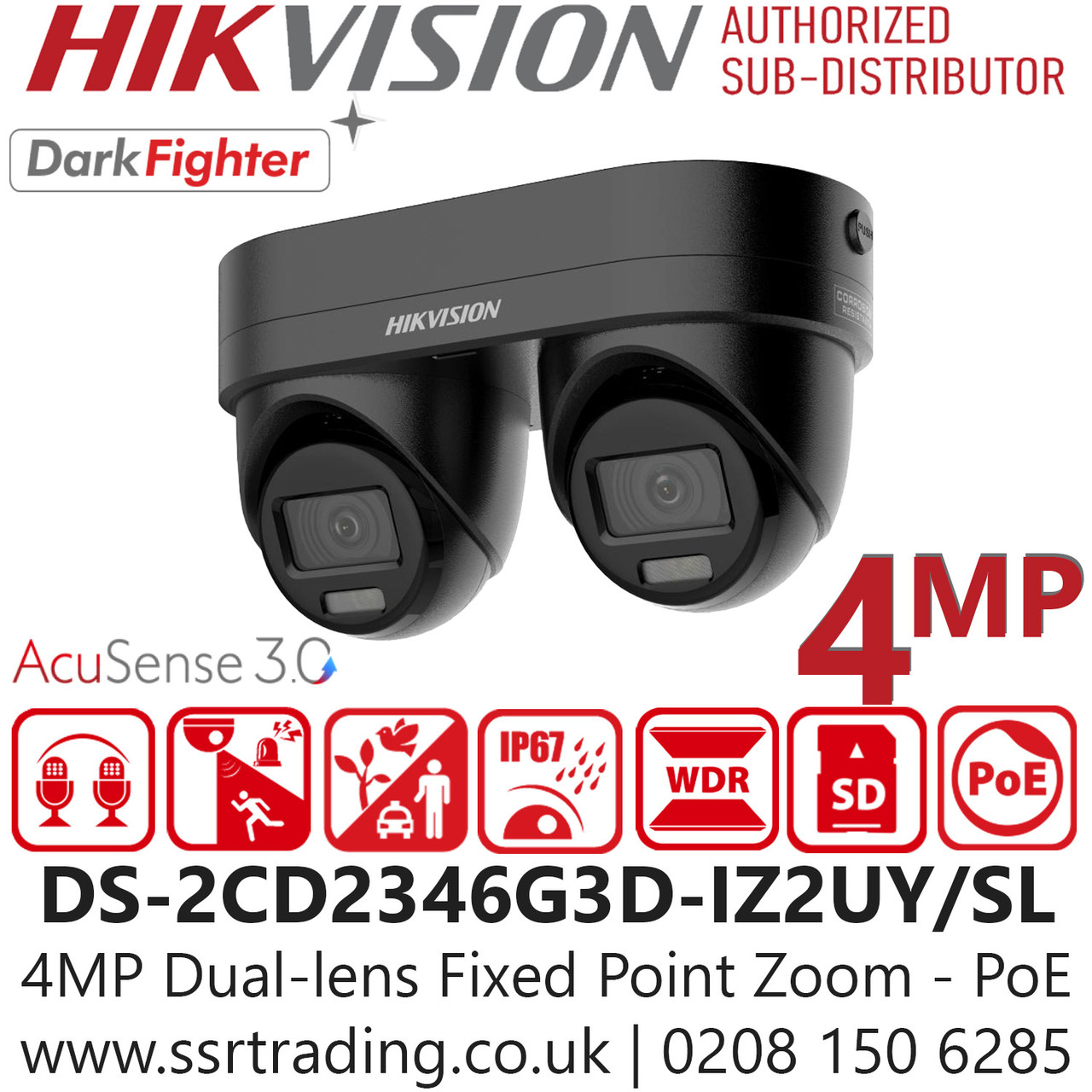 Hikvision 4MP Dual-lens Fixed Point Zoom Turret IP PoE Camera, Anti-corrosion Design (NEMA 4X), Crystal-Clear Audio with Arrayed Dual-Mic - DS-2CD2346G3D-IZ2UY/SL/Black (2.8/4mm)