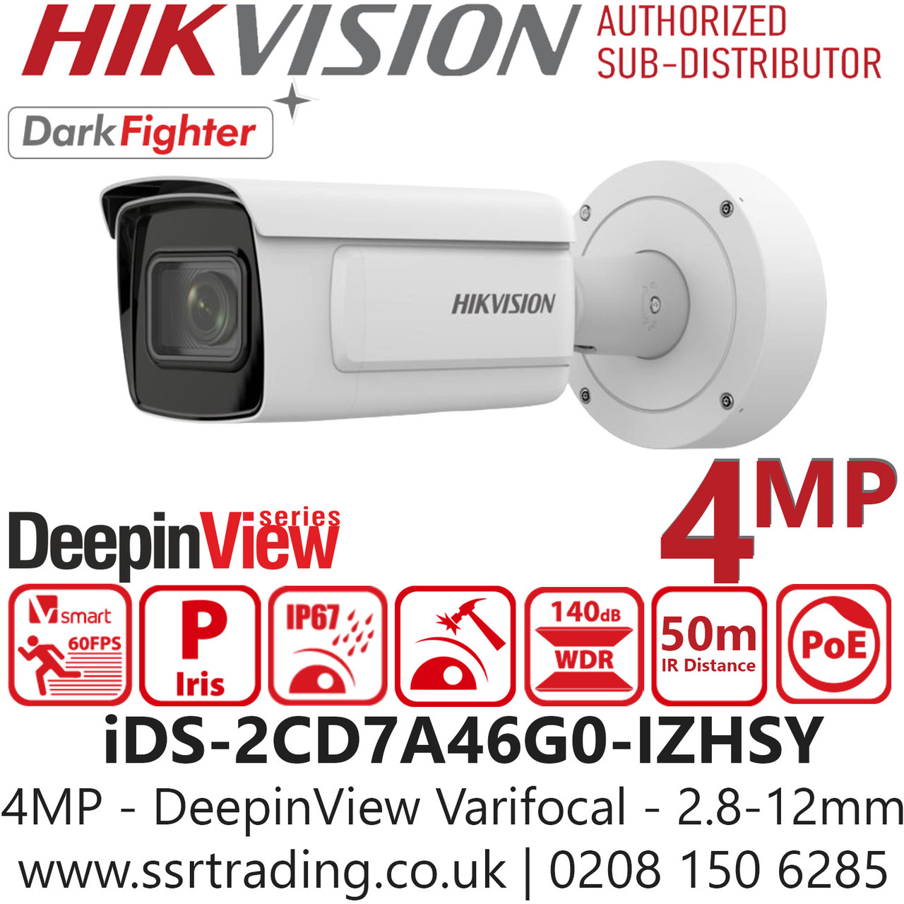- Hikvision 4MP IR DariFighter DeepinView Varifocal Bullet Network PoE Camera with 50m IR Distance, IP67 Water and Dust Resistant, IK10 Vandal Resistant - iDS-2CD7A46G0-IZHSY (2.8-12mm)