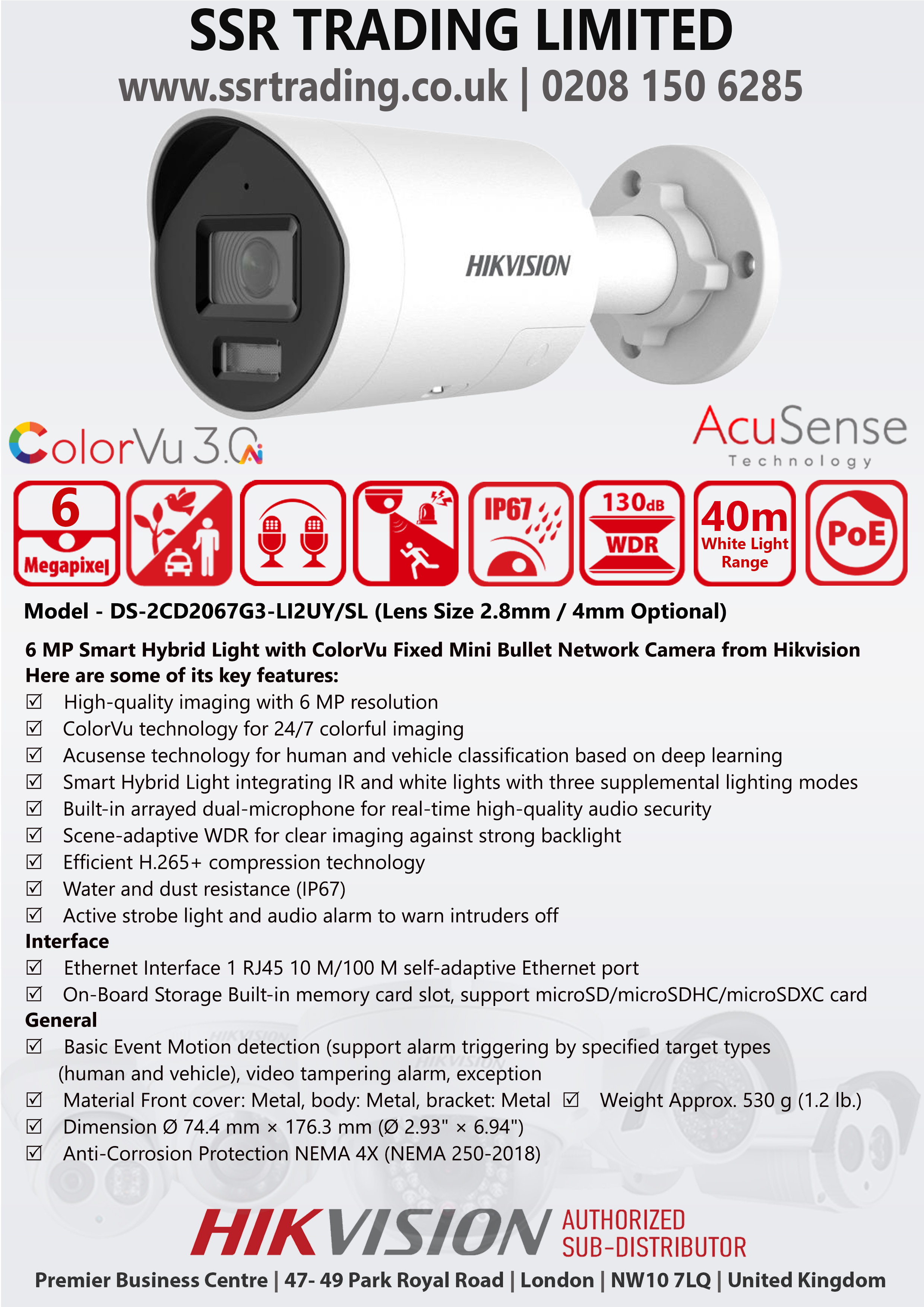 The DS-2CD2067G3-LI2UY/SL is a 6 MP Smart Hybrid Light with ColorVu Fixed Mini Bullet Network Camera from Hikvision. Here are some of its key features: