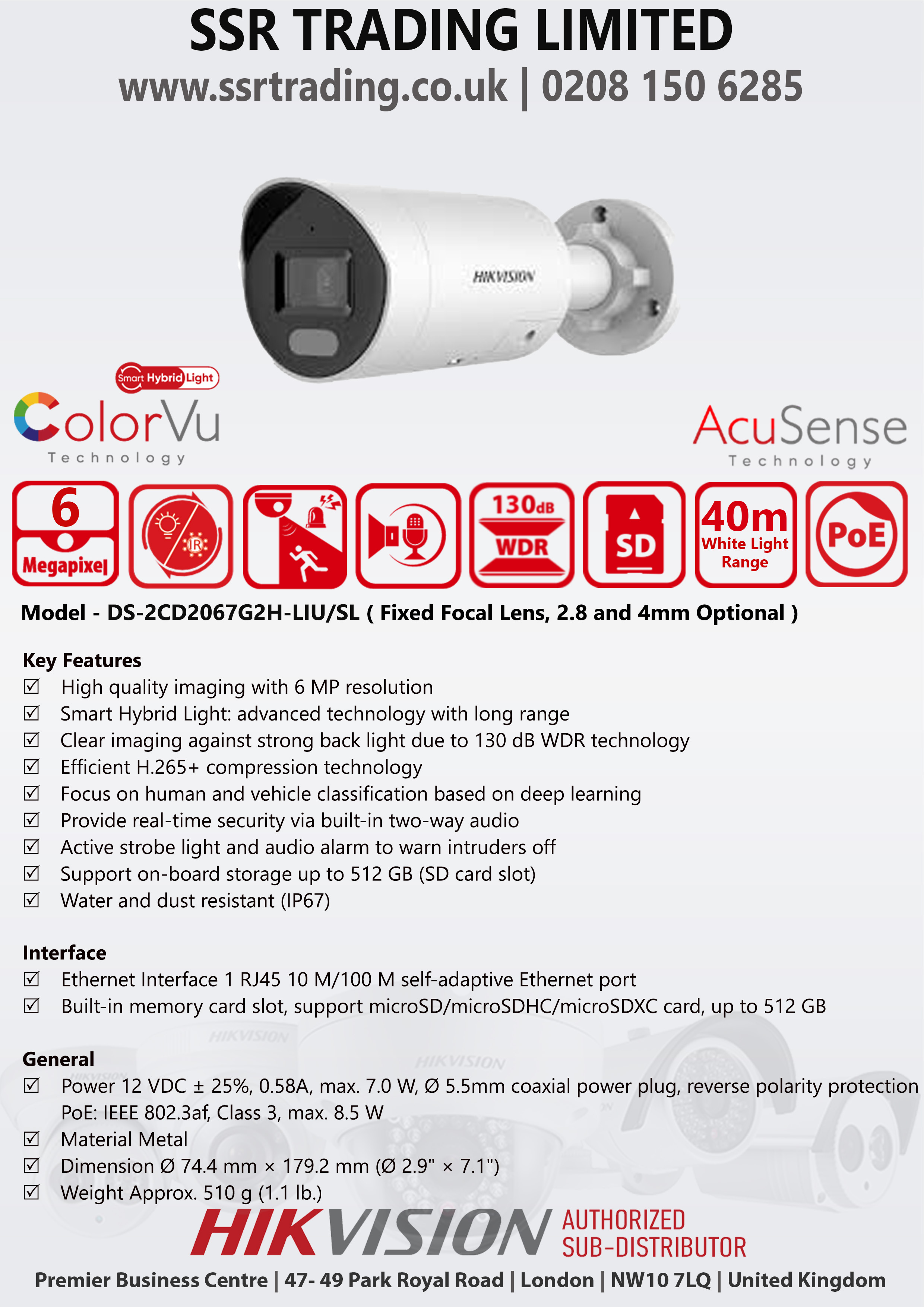 Hikvision DS-2CD2067G2H-LIU/SL 6MP AcuSense Smart Hybrid Light ColorVu Fixed Mini IP Bullet Camera With 2.8mm Fixed Lens, Active Strobe Light