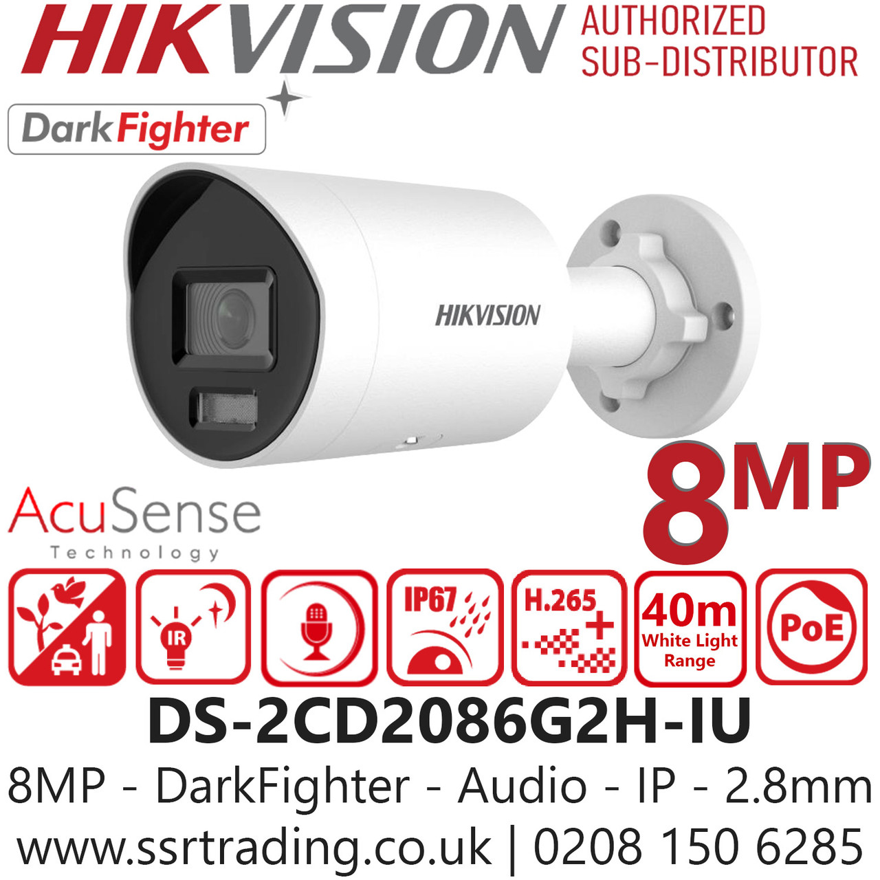 Hikvision DS-2CD2086G2H-IU (2.8mm) 8MP Darkfighter Mini Bullet PoE Camera with 2.8mm Fixed Lens, Built-in Microphone, IP67 Water and Dust Resistant