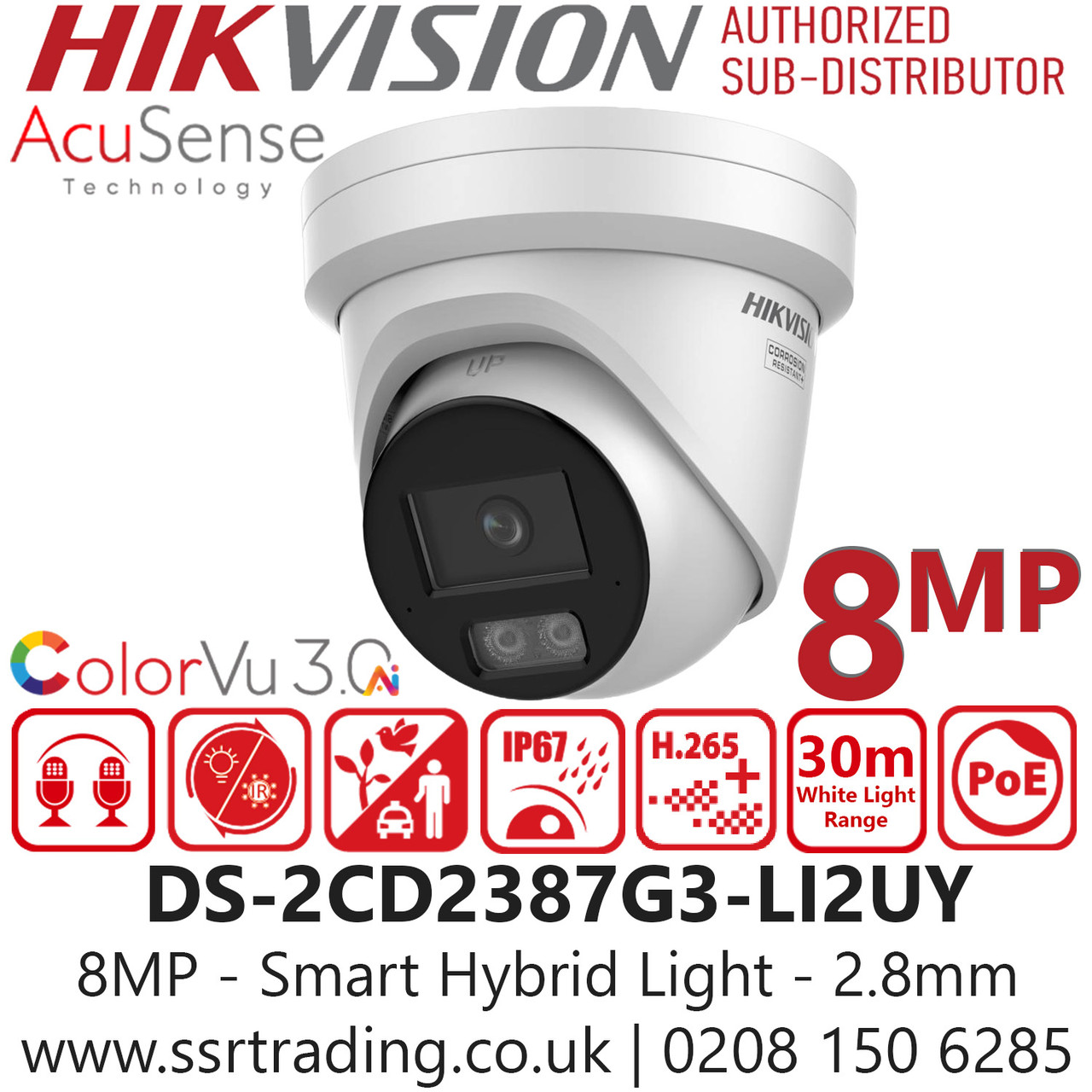Hikvision DS-2CD2387G3-LI2UY (2.8mm) 8MP Smart Hybrid Light with ColorVu Turret IP PoE Camera with 2.8mm Lens - Scene-Adaptive WDR - Built-in Dual Microphone - Anti-Corrosion Design - Water and Dust Resistance: Rated IP67 for outdoor use