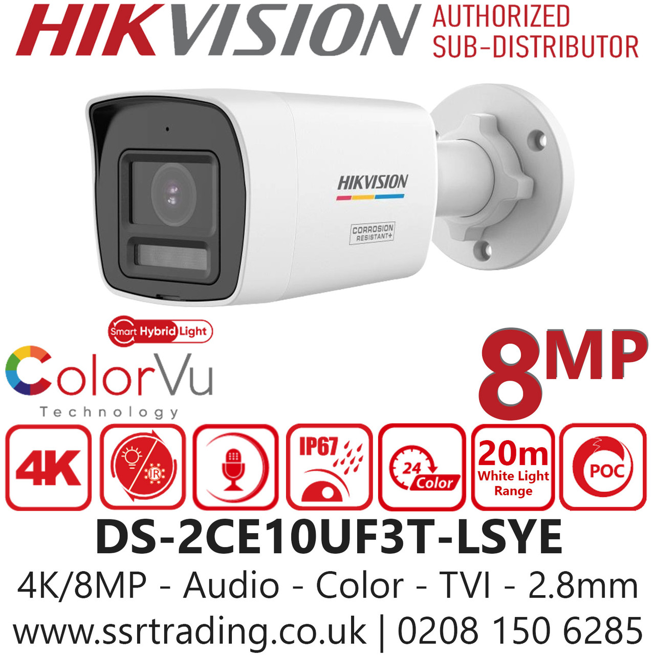 The Hikvision DS‑2CE10UF3T‑LSYE is a 8MP ColorVu bullet camera designed for superior 24/7 surveillance. With advanced ColorVu technology, it delivers full‑colour video even in extremely low‑light environments, ensuring clear detail and reliable monitoring. Featuring a 2.8mm/3.6mm fixed lens, Smart IR up to 30m, 20m White Light Range, and True WDR, it provides sharp, balanced images in challenging lighting conditions. Its rugged IP67 weatherproof housing makes it ideal for both indoor and outdoor installations. NDAA compliance, easy installation, and dependable performance make the DS‑2CE10UF3T‑LSYE a trusted choice for residential, commercial, and industrial security setups requiring vivid full‑colour imaging.