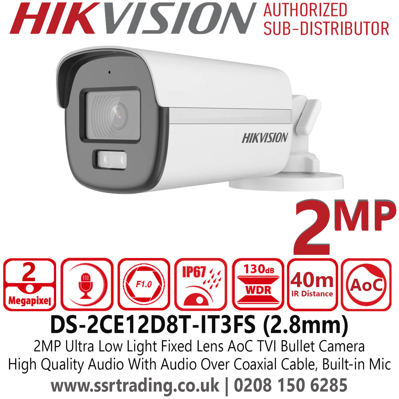 Hikvision DS-2CE12D8T-IT3FS (2.8mm) 2MP Ultra Low Light AoC Bullet Camera with 2.8mm Fixed Lens - 40m IR Range - Built-in Mic - IP67 Water and Dust Resistant