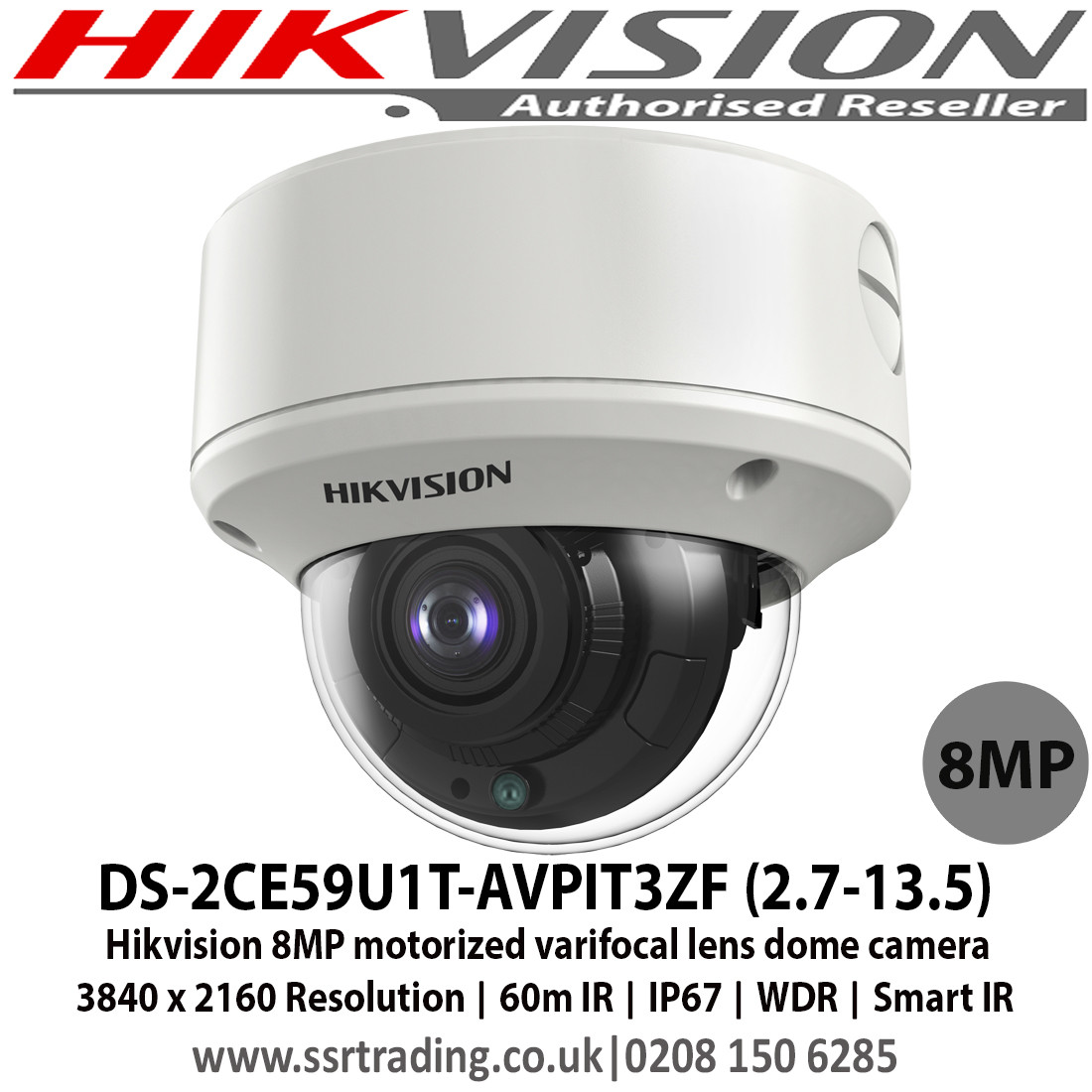 Hikvision DS-2CE59U1T-AVPIT3ZF 8MP motorized varifocal lens dome camera with 4K high resolution, 2.7 - 13.5mm motorized varifocal lens, Up to 60m IR distance, IP67 weatherproof, 4 in 1, can be used as TVI, CVI, AHD or Analogue camera
