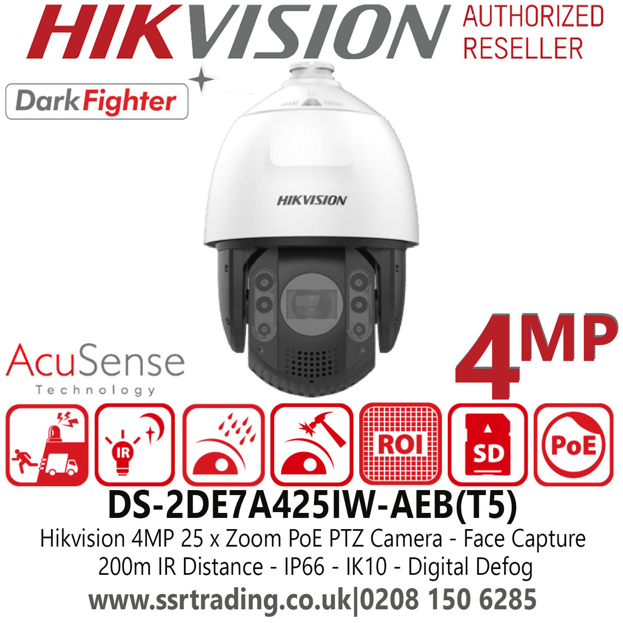Hikvision DS-2DE7A425IW-AEB(T5) 4MP PoE IP Outdoor AcuSense Darkfighter Face Capture PTZ Camera with 25× Optical Zoom, 4.8mm to 120mm Focal Lens, 200m IR Range, IP66, IK10, 120 dB WDR, Digital Defog
