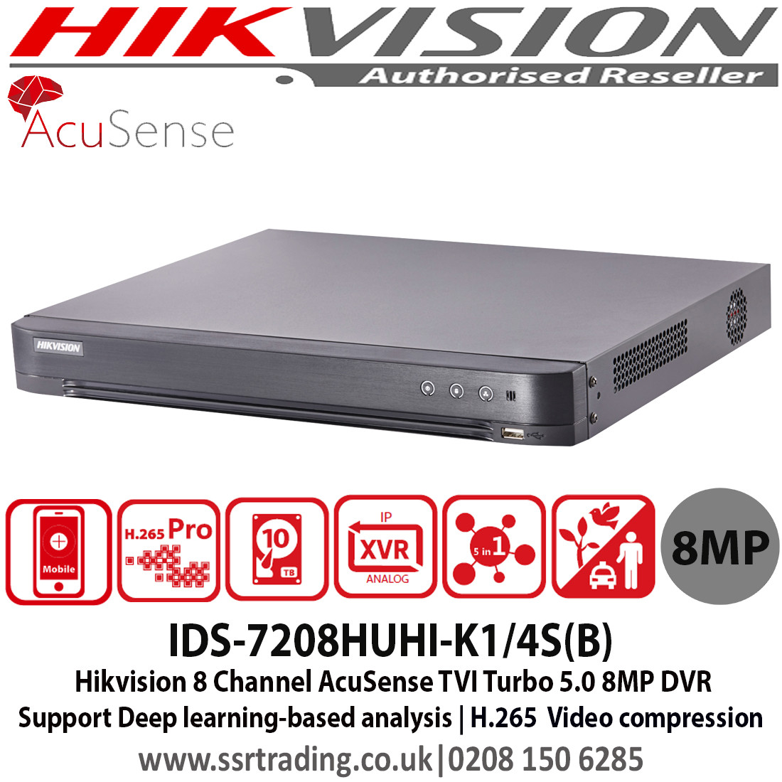 Hikvision IDS-7208HUHI-K1/4S(B) 8 Channel AcuSense TVI Turbo 5.0 8MP DVR, Connectable to HD-TVI, AHD, IP, CVI & analogue cameras