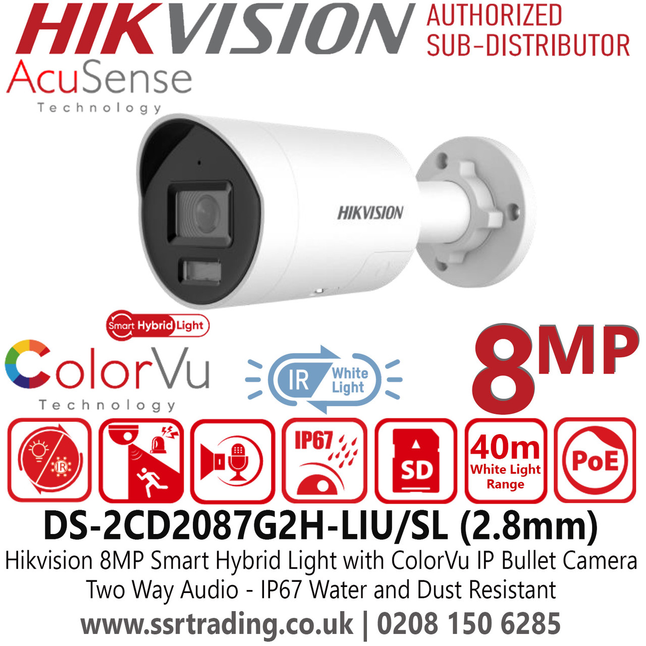 Hikvision Latest CCTV IP PoE Camera with 8MP Resolution, Smart Hybrid Light, AcuSense Technology, 2.8mm Fixed Lens, Two Way Audio, IP67 Water and Dust Resistant, 130dB WDR - DS-2CD2087G2H-LIU/SL/(2.8mm)